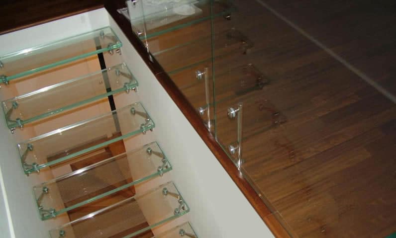מדרגות זכוכית בשילוב עכבישים המיוצרים באלום סטייל מנירוסטה מלאה וללא יציקה. שיטה ייחודית לתפיסת מדרגות זכוכית לקיר, כדי ליצור חוזק למדרגות עד 300 ק"ג למדרגה.